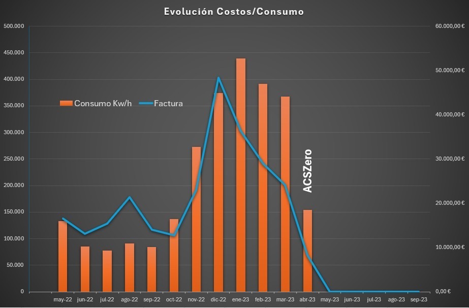 Una vez el sistema ACSZero se activa, el consumo de energía decae de forma abrupta. Pero que mejor que ver un ejemplo real con facturas reales.